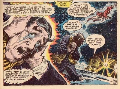 Cardy was an artist who never felt bound by the standard comic book grid, and in this story he really cuts loose, eliminating panel borders, overlapping action and giving the entire story an amazing sense of movement. Here's a moment near the end where Mr. Scrounge finally starts to feel the Christmas spirit...