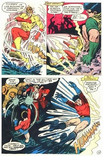 Here's a page featuring the other Titans. Look at how Cardy pulls your eye across the top of the page with Kid Flash's speed lines and colorful costume going from panel 1 to panel 2. Then, in the bottom half of the page, he switches to an all-black background to make Aqualad stand out, and finally goes mostly white to pull Aqualad (and again, the reader) right off this page an onto the next. None of this, of course, is anything I consciously noticed when I was eight years old and reading it for the first time. But I did know that, as much fun as the other reprints in this volume were, none of them had the feeling of action and speed that this story possessed in spades.