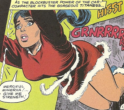And let's give credit where credit is due -- Cardy knew how to draw women. Here, for example, is a shot of Wonder Girl in her Santa suit trying not to be crushed in a car compacter. Cardy draws her like a real women, not some stick-figure with giant breasts but a solid-looking superhero you know could take care of herself in a fight. And, needless to say, she's damned sexy, too.
