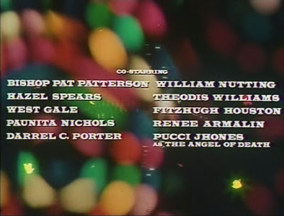 I didn't recognize any of these actors, but I wanted to shine a spotlight on that last credit -- "Pucci Jhones as The Angel of Death." Again, like seeing a character named "Sweetmeat," this is a sign that you're about to experience something truly special.