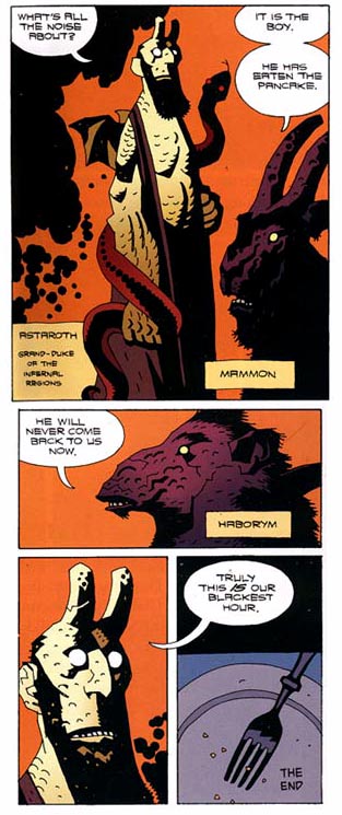 "Pancakes," story, pencils and inks by Mike Mignola, colors by Dave Stewart, letters by Pat Brosseau. Originally published in black and white in Dark Horse Presents Annual 1999, reprinted and colored in "Hellboy Vol. 4: The Right Hand of Doom" (2000).