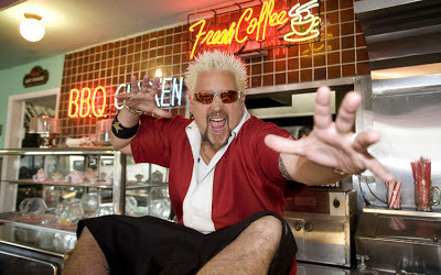Diners, Drive-Ins and Dives: So-called "hate-watching" gets a bad rap. Sometimes, it's the only way to enjoy what's on TV at any given moment. (And now, right on cue, the voice of my father echoes in my head .... "You could turn it off..."). Thus, my convoluted relationship with Mr. Fieri. To be honest, I only hate-watch half of the show. I actually enjoy the trips to various restaurants and the scenes where the local chefs demonstrate how they make their signature dishes. The rest of the show -- i.e., everything involving the goof in the above photo -- is where that much-maligned hate-watching comes in. Jeez. You can practically smell the Axe Body Spray wafting off your TV.