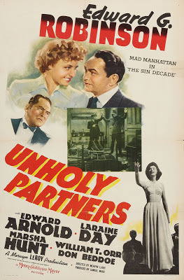 Two of my favorite actors (that would be Mr. Robinson and Mr. Arnold) in a newspaper/crime drama sounds like something right up my alley, but the elements in "Unholy Partners" never quite come together. Robinson plays a returning WWI doughboy who decides to start his own newspaper that will (a) be smaller than a broadsheet (but apparently not a tabloid) and (b) tell the real news, the tough news, the news when -- or, if possible, before -- it happens. Naturally, with a screwy business plan like that, he has trouble finding investors. Not so naturally, he winds up turning to local crime boss Arnold. I think you can see where this is going, and that's exactly where it goes, with only some sharp black-and-white cinematography and fun performances from the two leads to keep things interesting. Too bad. Talk about a wasted opportunity.