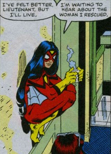 Spider-Woman sits on a wall and drinks a cup of coffee.