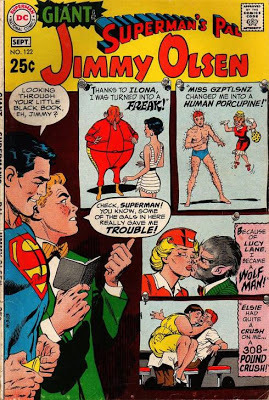 Jimmy Olsen turns into a freak so creepy (top left image) that it disturbed me for years, even though I only saw it in on a tiny cover reproduction (much smaller than seen here) in a DC house ad when I was a kid.