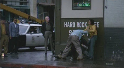 The opening credits feature what looks like genuine footage of Los Angeles derelicts slugging it out in front of a bar called ... the Hard Rock Cafe.