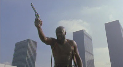 I've joked a lot about the over-the-top look of "Truck Turner," but the truth is this movie knows exactly what it's doing, and the comedic and outrageous moments are completely deliberate. It's not so bad it's good, it's genuinely good, delivering a fast-paced, action-packed story with colorful characters and some fun plot twists. And just look at that shot of Hayes with the buildings of Los Angeles behind him. Director Jonathan Kaplan knows how to make a visually interesting movie, and he really knows how take advantage his Los Angeles locations. The chase scenes alone make the movie worth watching as a sort of mid-70s L.A. travelogue.