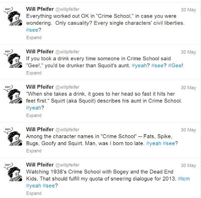 About three years before he became a major star in "The Maltese Falcon," Humphrey Bogart was second-billed to the Dead End Kids in this 1938 movie about a bunch of good-hearted bad boys (guess who?) tossed behind bars because they wouldn't squeal on each other. There's not a whole lot that's interesting about this movie, I'll admit, so instead of rambling on here, I'll share the comments I Tweeted while watching it. (Follow me on Twitter at @willpfeifer if this is the sort of old movie nonsense you crave)