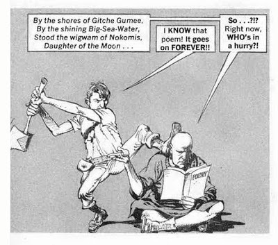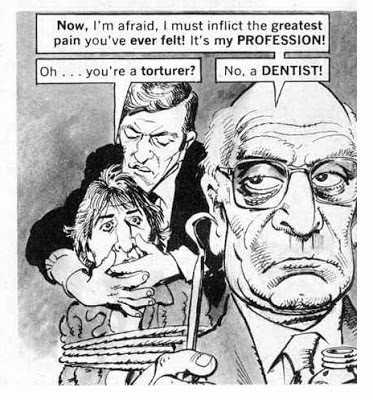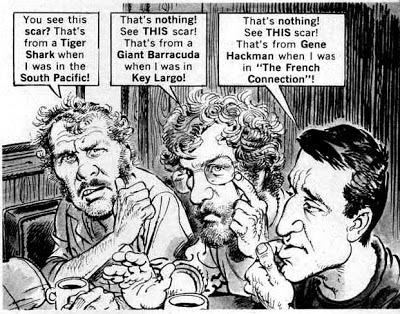 "A Crock O' Blip Now" in MAD #215, June 1980Actually, it wasn't until this month I finally did see "Marathon Man" (look for a write-up in the next monthly movie blogpost), but I remembered some of the scenes from "Marathon Mess," which I must've last read at least 30 years ago. And even now, after seeing "Apocalypse Now" dozens of times, my head still fills in the spoof title, "A Crock O' Blip Now," and remember how the "Blip" in the title cleverly blocks out the partially visible word "Shit" on Mort Drucker's double-splash panel. Pretty edgy for the normally profanity-avoiding MADmen.