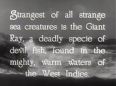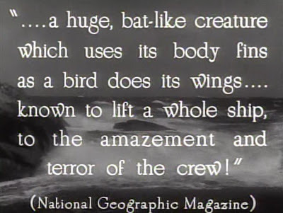 I realize the great thing about science is that it evolves over the years as more knowledge is acquired, but even way back in 1930 did the respected scholars over at National Geographic really believe that the manta ray was a "devil fish" and a "huge, bat-like creature" that was "known to lift a whole ship"? I call shenanigans on this bit of background info, but I love how they tried to convince Depression-era audiences that the hokum (thanks, Leonard) they were about to spring on them was genuine.