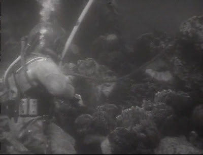Okay, enough foreplay. Let's get to The Sea Bat himself. He arrives near the beginning, when Raquel's doomed brother dives down in search of those sweet, sweet sponges. Even before the monster makes his appearance, the diving scenes are fascinating as a historical artifact. No special effects here, friends. Those are real guys in antique diving suits, and I'm guessing getting those shots was a dangerous undertaking all by itself. This is a long time before scuba tanks were invented, remember...
