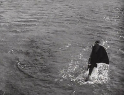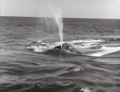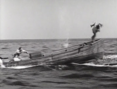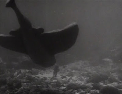 All complaints about accuracy and blowholes aside, The Sea Bat is a genuinely impressive creation. A few of the shots are miniatures (like that one above of the beast descending on the diver), but in most of the scenes, The Sea Bat is a full-size effect, either pulled by a boat or driven by a motor underneath. Believe me, it's at least as convincing as the shark in "Jaws" (released 44 years later). What's more, the scenes of The Sea Bat pursuing a small boat at the end were, like "Jaws," shot on open water, which gives the movie a nice sense of scale.