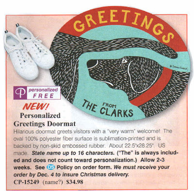 Continuing our seasonal examination of the "Lighter Side Co." catalog, we arrive at the "hilarious" "Personalized Greetings Doormat," with its "very warm" welcome...