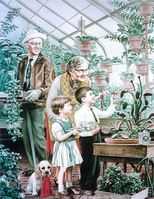 Here's a classic painting Elder did in the heartwarming style of Norman Rockwell, depicting a scene that becomes less and less heartwarming the more you look at it (then again, the activity does bring the generations happily together).