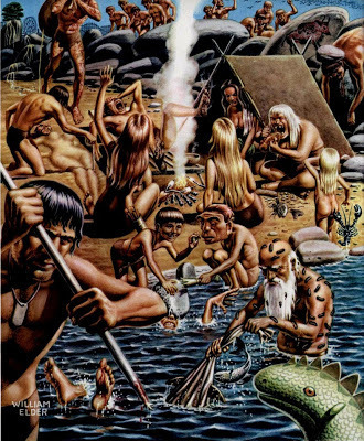 I've devoted a lot of space to Elder's pen-and-ink work in this series, but the guy was a very talented painter as well. Here's an image from the "Our Own Epic of Man" piece from the short-lived Kurtzman mag Trump that spoofed the elaborate, ponderous pieces about early man that ran in magazines like Life and Look.