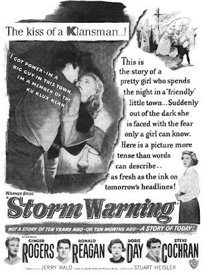 Pretty decent melodrama about Ginger Rogers fighting the Klan in a small town. Doris Day has a small part as the wife of twitchy Steve Cochran, who is, of course, a Klanster. Ronald Reagan saves the day, but not before Rogers is viciously whipped at a Klan rally -- with plenty of Klan-klad kids watching. Creepy!