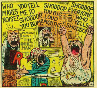 The joke, of course, is that everyone yells loudly while complaining about everyone yelling loudly. As a gag it's not one of Kurtzman's best, but the sheer energy Elder brings to the art makes it work. I love Starchie's mom slapping his dad in his shirt (that, for some reason, has a cat hiding in it) with the sound effect "SMEK," and though I had no idea what "The Quiet Man" was back when I read this as a kid, I appreciate the nod to classic John Ford. And, best of all, I love how Starchie is so upset that the criss-crossing has actually left the side of his head and jumped off into the open air.