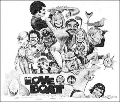 Sharp-eyed fans of '70s television will spot caricatures of Florence Henderson, Don Adams, Tom Bosley, Gabe Kaplan, Harvey Korman, Hal Linden and Karen Valentine. There's also a very Jaws-esque shark in the water, though what sort of danger a single shark could possibly pose to a cruise ship I don't know.
