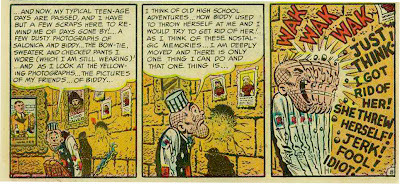 See, typical teenager Starchie is in prison, having been double-crossed decades ago by his typical teen-aged pal Bottleneck, Turns out ol' Bottleneck was actually Edward G. Robinson in disguise, and he muscled poor Starch out of his typical teen-aged rackets while simultaneously turning him over to the police (in the form of -- who else? -- Dick Tracy). So, in the story's final panels, Starchie sits in his cell, looking back at his life -- at old friends, good times and missed opportunities...