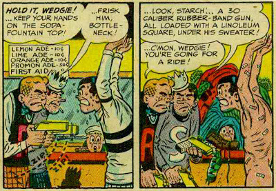 The salute to Harvey Kurtzman and Will Elder's "Starchie!" satire continues with this bit of pre-(Comics) Code nudity as our "heroes," Starchie and Bottleneck frisk their typically teen-age rival, Wedgie...