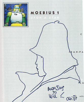 In what must have been some sort of promotional effort for that series, the man himself was one of the guests of honor at the Chicago Con back in 1987. Quiet but friendly and more than happy to meet with his fans, Moebius signed my copy of "Upon a Star," the first volume of that Epic series. And, what's more, he even did a little sketch...