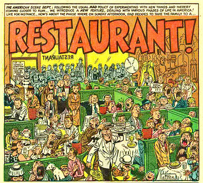The first Will Elder stories I remember seeing in Mad reprints during my misspent youth were "Starchie!" and "Mole!," but the first Will Elder story -- make that panel -- that I remember being impressed -- make that astounded -- by for the sheer technique on display was this one, the opening splash from "Restaurant!" from Mad #16, Oct. 1954...