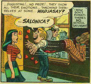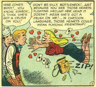 As promised, here's more from "Starchie!," the classic Kurtzman/Elder satire from the 12th issue of Mad. As you can the Betty-and-Veronica (or, in this case, Biddy-and-Salonica) rivalry has been going on for well over half a century, and naturally, Kurtzman and Elder offered their twisted take on this teen love triangle. I love how the visual gags are both corny and innocent (spades to go with those iconic comic book hearts) and dark and ominous (Biddy was carrying quite the stash of drugs, wasn't she?).