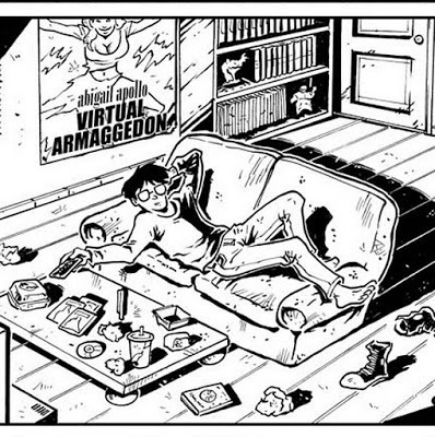 ,Our hero, one Zack McKinley, lounges after a hard day of delivering pizzas and watches some TV. There's a cheesecake element (that poster on the wall), plenty of junk food (get a load of that coffee table) and a pair of Chuck Taylor All-Stars visible somewhere in the panel. It's drawn by German Torres, by the way, which is one reason it's a big improvement over this panel...