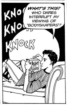 That's the one from "Violent Man," written by, drawn by and (yeesh) starring yours truly. As before, we've got the cheesecake element (a reference to the 1990s "fitness" show "Bodyshapers" (actually, as I've since learned, it was called "Bodyshaping," meaning I got it wrong all those years ago), some junk food (the Violent Man Snaps cereal -- hey, I thought it was clever joke) and, barely visible (but I assure you they are there) a pair of Chuck Taylor All-Stars. We've also got a pair of jeans with ripped knees and a shirt from the Linus collection, but after all, it was the 1990s.