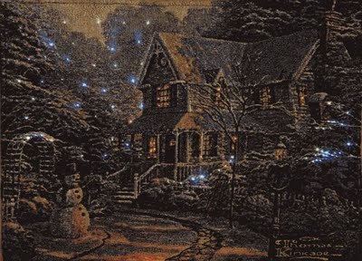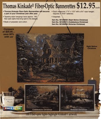 Yes, it's the "Thomas Kincaid Fiber-Optic Bannerette." Not a banner -- not exactly -- but a smaller, cheesier, tackier simulation of an actual banner. And the fabled (and trademarked) "Painter of Light" doesn't just paint the light this time around, he (well, his underpaid minions) actually attached actual lights to the actual banner -- excuse me, the actual Bannerette. Let's take a closer look at that artwork, shall we?