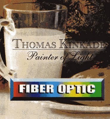 I love, of course, the official Thomas Kinkade slogan, "Painter of Light," rendered as it is in a very, very classy font. But even better is the rainbow alert that this artwork does, in fact, use FIBER OPTIC technology. Apparently the company really, really didn't want us to miss that little fact. I wonder if I could buy a print of just that logo? (And what's in that glass? The milk of human kindness, I'll bet!)
