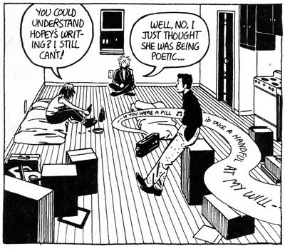 The panel itself means a lot more surrounded by the others on the page, and the story means even more when it's read in the midst of all those other Maggie-and-Ray (and Maggie, and Ray) stories -- several years' worth of them, in fact. But for some reason, that single image, with those three characters, two word balloons and, most importantly, that curving stripe of lyrics extending across the panel, somehow that sums up everything I love about Love & Rockets ... and music, and comics, and pretty much everything. Thanks for drawing it, Jaime.