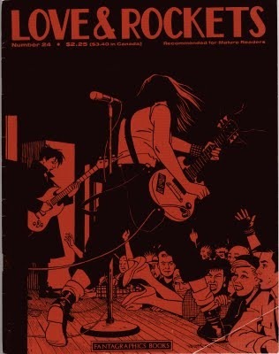 As it turns out, that was a landmark evening, kicking off the long and complicated relationship between Maggie and Ray. But all that mattered to me, back in 1987, back in college, back reading that original issue off the stand, was that two of my worlds -- comics and music -- were finally colliding. I'll never forget how surprised and happy that panel made me. Still does, in fact, even after all these years.And it didn't hurt that the issue also happened to have my favorite Love & Rockets cover. No, strike that -- my favorite comic book cover...