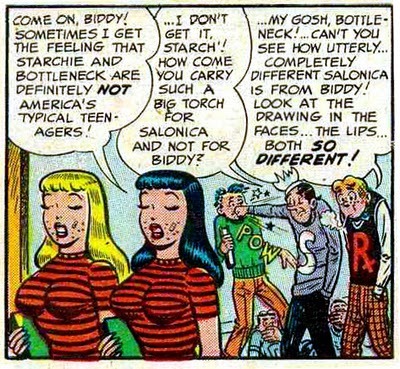 Like most (all?) Elder panels, this one has a ton of stuff going on, but I especially like how Elder draws Biddy and Salonica. Not only are identical (which is the main joke of the panel) and not only are they inappropriately attractive (which keys off the wonderful seediness of the entire strip), but they're draw in a way no high school comic book girls are ever drawn -- namely with bad skin and acne... you know, just like real high school girls! It's a small thing, but it's the sort of thing that elevated Elder's art past a mere imitation. He really brought something more to the equation -- something that made the original look different (and usually fake) in comparison.