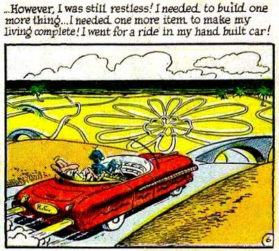 This week's panel comes from the Kurtzman/Elder adaptation (well, sort of) of "Robinson Crusoe!" from the thirteenth issue of Mad. I especially love how the story begins like the original (well, sort of), with our hero scavenging items from his ship (especially rum) and building "crude" shelter on the island upon which he's stuck. As you can see by the above panel, by the end of the story, crafty and resourceful Robinson has constructed a complex system of highways, a jet-powered car and a robot driver. Of course, there's one more bit of the story, with Crusoe using the brain of Friday (who, naturally, Elder draws to look like Joe Friday of "Dragnet") to create one final item ... WOMAN! It's the perfect sick twist for a perfectly twisted tale.
