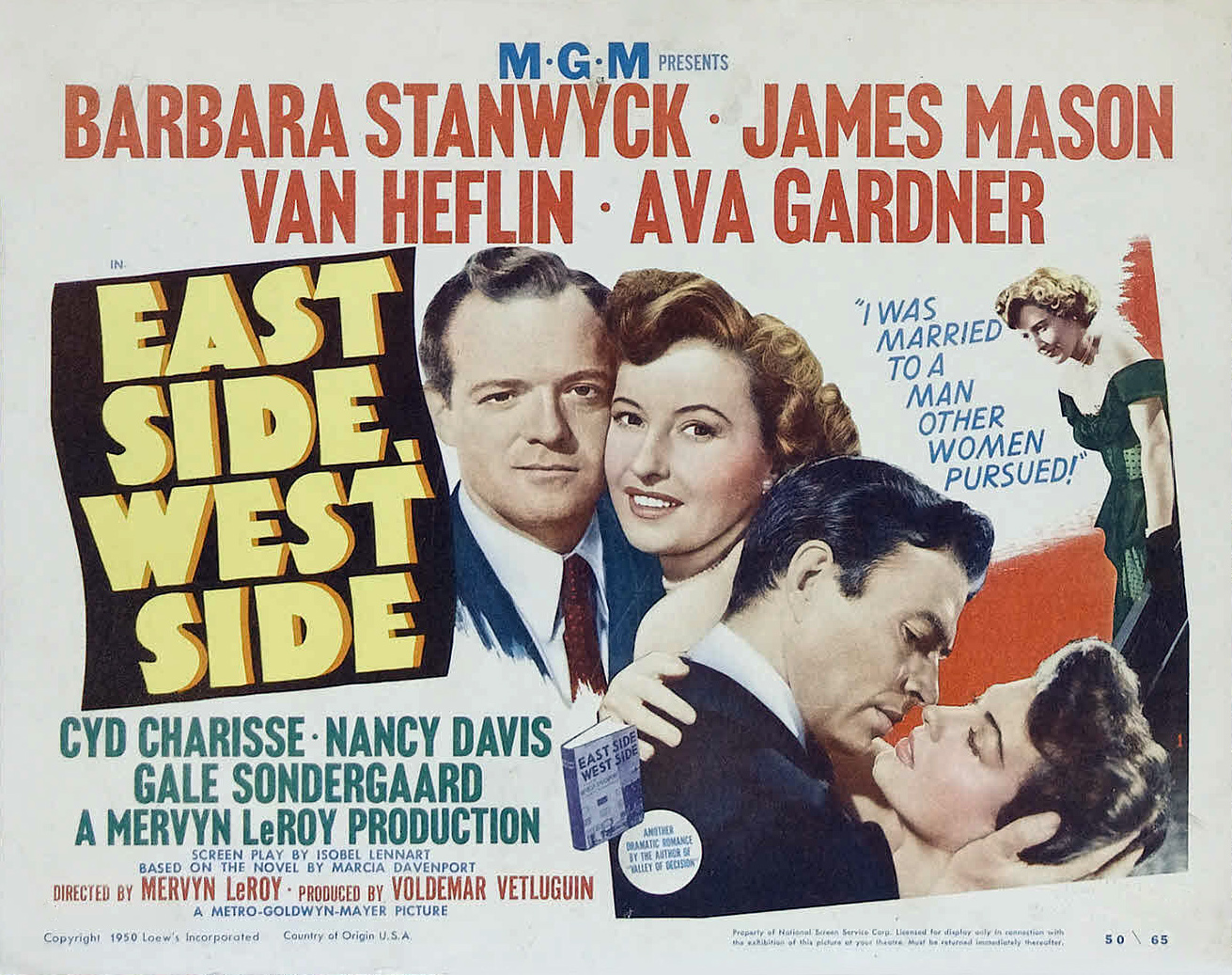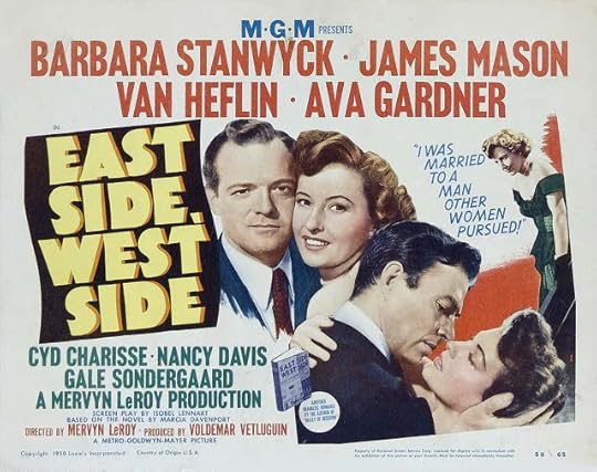 So-so “woman’s picture” (as they used to call them) with Barbara Stanwyck playing a rich socialite and James Mason playing the younger weasel who married her for her money -- but is more than happy to fall (back) into the arms of Ava Gardner, who almost wrecked their marriage a few years earlier. Into that soapy mix steps none other than Van Heflin, playing a spy (!) who spurns his young girlfriend, Cyd Charisse (!!) and falls in love with Stanwyck (!!!). Eventually, Gardner ends up murdered, and the suspicion falls squarely on Stanwyck and then … well, to be honest, I can’t remember what happened or how it ended, despite only seeing it about a month ago. It’s not a bad movie, not exactly, but there’s nothing plotwise to set it apart. I can only recommend it for the cast, which is pretty amazing. Besides the actors I’ve already mentioned (Stanwyck, Gardner and Mason are damned good), “East Side, West Side” also includes Nancy Davis (aka Nancy Reagan) as Stanwyck’s pal, William Frawley as a bartender and the great William Conrad as a cop.