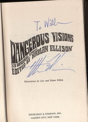 Though I still had (and still have) all those paperbacks from my high school days, I only had one actual Harlan Ellison hardback in my collection, so that's what I took to get signed -- a book club edition of "Dangerous Visions," the groundbreaking science fiction collection compiled and edited by Ellison that arrived on this planet in 1967, the same year I did.