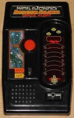 Yes, it's my old Mattel Electronics "Battlestar Galactica Space Alert" game, which I'm pretty sure I got for Christmas way, way back in 1978. I had to change the battery, of course, but the thing still works almost perfectly. It's as simple as a game can get, with a fire button and that joystick-sort-of-thing at the bottom that toggles your LED dot between the three spaces at the bottom of the screen. Other LED dots come down from above, and you have to "shoot" them, scoring more points the higher on the screen you hit them. If you take a hit in the middle space, you're done -- no extra men, no bonus rounds. Also, there's a set amount of attacks you have to endure, meaning your top score isn't going to be much more than 80 or so.