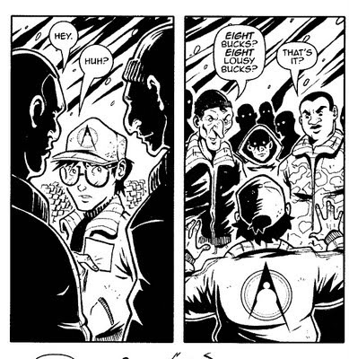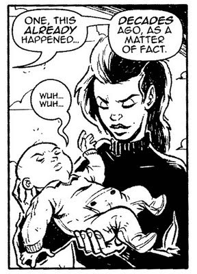 So, in that spirit, here are five fairly random panels from the book, offered without comment, that I hope you'll find intriguing. They're taken from all over the book, from beginning to end, and most feature our hapless hero, Zack McKinley, seen at various points in his haphazard, half-assed effort to save the world...