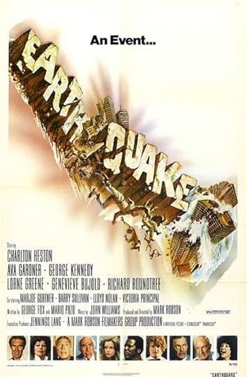 Continuing the semi-official 1970s disaster movie marathon that also included "The Towering Inferno" and "The Poseidon Adventure" (which I just realized I completely forgot to write about -- quick review, it's possibly the least fun of the three while also being the best actual movie), I slogged through this 1974 blockbuster that, believe it or not, was NOT produced by Irwin Allen. It uses the same formula as "Inferno" -- take a star-studded cast, spend a looooong time introducing them, then wreak havoc upon their location, in this case, downtown Los Angeles. The cast is admittedly mind-boggling in a distinctly 1970s way, with Charlton Heston leading the way, followed by Lorne Greene, Ava Gardner (as Greene's daughter!), George Kennedy, John Randolph, Genevieve Bujold, Richard Roundtree (as an Evel Knievel type daredevil), Barry Sullivan, Lloyd Nolan, Victoria Principal (in a crazy afro wig), Walter Matthau (in an uncredited cameo wearing a wild pimp outfit) and, sealing the deal, '70s mainstay Marjoe Gortner playing a maniacal grocery clerk/National Guard soldier. The effects aren't convincing, but they're BIG, and the whole thing was originally presented in Sensurround, meaning the theater shook during the quake scenes. It's not good, not by a long shot, but it's as concise a picture of pre-"Jaws" big-budget filmmaking as you're going to find. The strangest thing about it? The whole colossal mess was directly by Mark Robson, who edited Val Lewton's "Cat People" and directed Lewton's "The Seventh Victim," arguably two of the smallest (but best) movies Hollywood ever released.