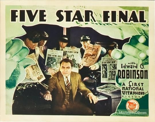 Speaking of Edward G. Robinson, he gives a lot of dramatic speeches in this movie, too, though it’s not nearly as polished and low-key as “Double Indemnity.” That’s not a slam, though – the frantic, overheated, borderline offensive style is perfect for this still-shocking portrayal of tabloid newspapers circa 1931. I’ve written about “Five Star Final” before on this blog (check here for a full review), but it’s one I always enjoy shining the spotlight on. The pre-Code movies released before 1934 are notorious for their scandalous content, but this movie really takes the cake, both for its overall plot (sleazy tabloid digs up a murder story from the past, resulting in a double suicide) and for its specific moments (hyping a planned – and no-doubt deadly – taxi race, promoter Ziggy Feinstein brags he’s going to let “an Irishman, a Jew and a Wop win”!) The whole movie is full of that sort of stuff, things you can’t believe made it to the screen 80-plus years ago. Boris Karloff plays a sleazy defrocked minister, Ona Munson plays an ex-hooker-turned-“reporter” who’s hired for her curvy figure, and Eddie G. plays the editor trapped in the middle of it all, alternately wallowing in the sleaze and feeling guilty about it. (He endlessly washes his hands.) When he finally has enough in the film's final scene, he tells the publisher he can “shove it up his –” with that final word replaced by the crash of the phone as he hurls it through a window. But we know what he said. We know exactly what he said.