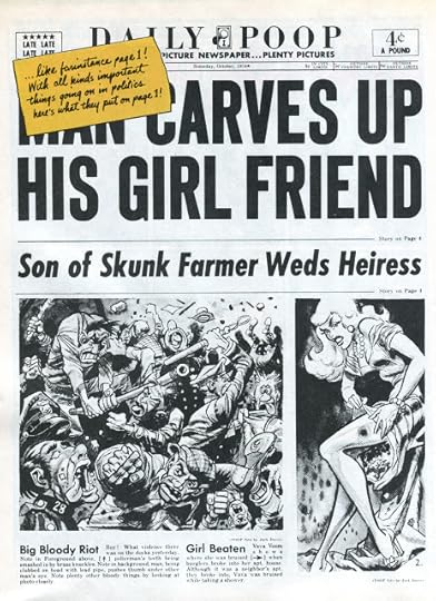 NEWSPAPERS! As the anti-comic book craze of the 1950s was peaking (but before it drove EC out of the comics biz and forced MAD to become a magazine), Kurtzman and Jack Davis unleashed this bold, wild satire of suppression, all under the guise of condemning the terrible influence of newspapers. Presented in the form of "pages" from a typical paper, it proceeds section by section, from the front page (shown above) to the jam-packed back pages of sports, movie ads and other outrageous content. It's a great satire of censorship and public hysteria, sure, but it's also a great example of how many jokes the MAD crew could cram into a single story.
