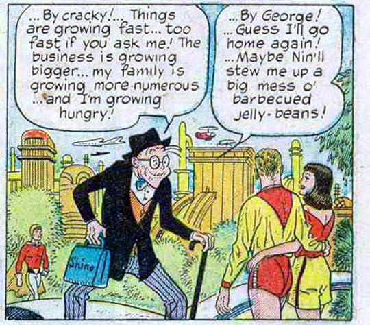 GASOLINE VALLEY!Will Elder was, perhaps, the greatest mimic ever to work in comics, but what really made his art special was the way he could capture another cartoonist's style while adding a subtle, twisted twist. That quality might be best illustrated in this parody of Frank King's classic strip. King legendarily had his characters age in real time, but Kurtzman and Elder compress that concept hilariously, having baby "Skizziks" (spelled backwards is "Skizziks") go from infancy to old age in a few pages. It goes beyond merely funny to downright surreal, but it never loses that gentle, heartwarming King-esque touch.