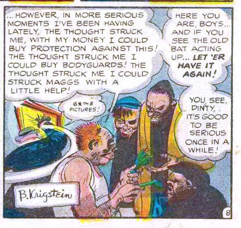 BRINGING BACK FATHER!Less well known than old favorites like "SuperDuperMan!" and "Starchie!," probably because (a) it hasn't been reprinted nearly as many times and (b) the comic strip it's spoofing, George McManus' "Bringing Up Father," has been largely forgotten. That's a shame because it's one of the best pieces ever to appear in MAD, right up there with the others comedy-wise and arguably even better concept-wise. The story alternates between Will Elder's dead-solid-perfect imitation of McManus' art, then shifts every few pages to a grittier, more "serious" style courtesy of Bernie Krigstein. What makes it work is that Kurtzman's script ends each Elder segment with typical, laff-filled bit of comic strip violence, with Krigstein depicting the grim aftermath as the lead character gets more brutally abused and more dangerously angry about it. It all ends with grim justice being served and perhaps the darkest "moral of the story" in comic book history.