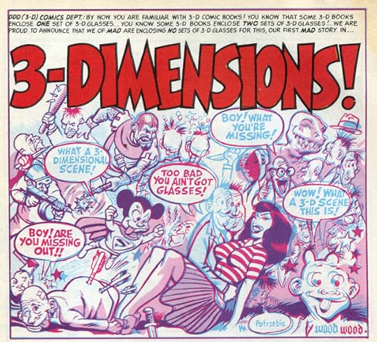 3-DIMENSIONS!In this brilliant spoof of the (then current) craze in 3-D comics, Kurtzman and Wood take things as far as they can go, then push them even further. The 3-D characters break the fourth wall repeatedly (my favorite bit is when one of them holds up an image of a piece of paper labeled "TOUCH HERE," then explains how, thanks to 3-D, what the reader is touching actually feels (and smells!) like paper). At the end, they tear through the comic itself, revealing a page further in the story, then finally wind up on something I don't think I've ever seen before (or since) in a comic -- a completely blank piece of paper. (I saw the original art for this story at the Masters of Comic Book Art show in Milwaukee back in 2006, and yes, that blank page of comic paper was included.)