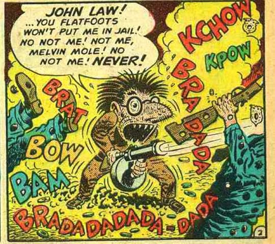 MOLE!One of Will Elder's earliest MAD stories (from issue two) and one of the first vintage MAD stories I remember reading. As a kid, I loved it because it's a simple story with ever-escalating violence (see above) that I found hilarious, and as a grown-up I love it because it's such a beautiful example of Elder's own cartooning style unleashed in a such a maniacal, over-the-top fashion (see also above). Plus there's a sequence at the end with a naked, shaved Mole escaping from prison one last time that never fails to kill me.