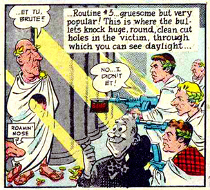 JULIUS CAESAR!One of the densest strips in MAD history (which is really saying something), this Kurtzman-Wood piece begins with a page blasting all the MAD imitations suddenly crowding the comic book rack (including EC's own "authorized imitation," PANIC), then uses a spoof of the 1953 Marlon Brando-starring "Julius Caesar" to illustrate how a satire is done, point by painstaking point. In the end, much like "3-DIMENSIONS!," things go completely insane as our bow-tied narrator pulls off his mask to reveal that he's actually Marilyn Monroe (shown as a photograph) and, what's more, he pulls back the last page of the story to reveal you've actually been reading a Mickey Mouse comic book all along. It's pretty amazing, even more than 50 years later.