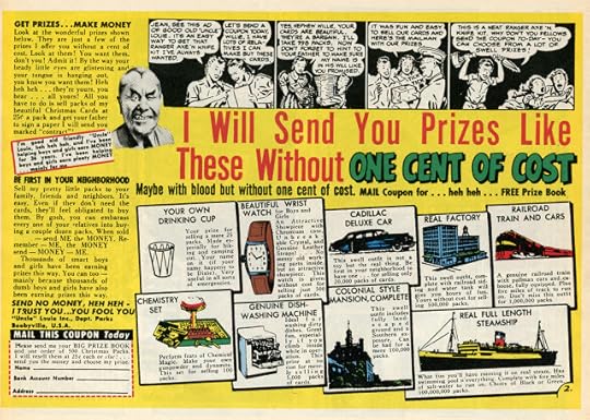 COMIC BOOK ADS!And finally, this is the sort of thing that really blew my mind when I first encountered the comic book version of MAD. Just like in STARCHIE! and GASOLINE VALLEY!, Will Elder's uncanny knack for mimicry recreated a classic comic book element, but with a distinctive, subversive twist. What's different in the case of this feature is that thanks to realistic typesetting and Kurtzman's dense but dead-on prose, they REALLY, REALLY looked like genuine comic book ads, and only when you looked closely and saw, for example, the prizes varied from a drinking cup to a "real full-length steamship" did you realize something was up. The cover of this issue (#21) took things even further, flawlessly duplicating and satirizing an entire Johnson Smith-type ad. I loved that image so much I made it the background of the very blog you're reading right now.