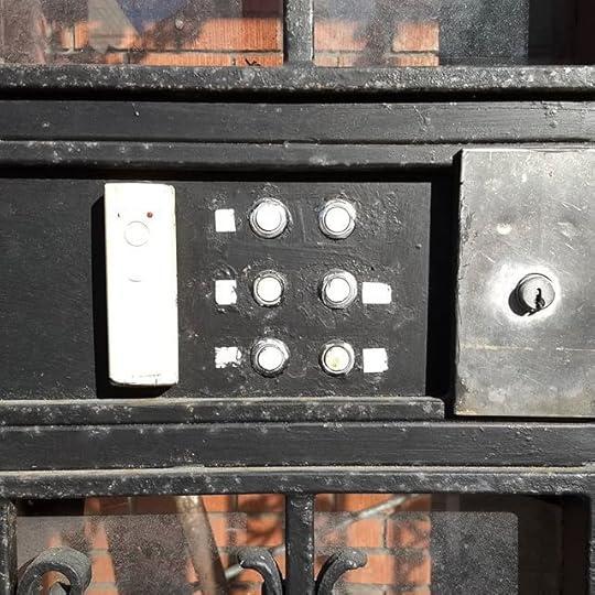 This doorbell is from the front gate to a multi-unit apartment building in just such a neighborhood. The doorbell bears the aspect of a place that has more urgent things to be attended to than its outward appearance. The doorbell buttons have long since been bleached by the elements of their associated apartment numbers. Presumably the units run in descending columns from left to right. Presumably as well, the one button that lacks a label was at some point replaced — due to wiring complexities or sufficient landlord laziness, for which there is an admittedly low threshold — by the larger plastic device to the left. It stands there with a simple message for anyone who tries to catch its gaze: “I have things to get done; announce yourself, or move along.”