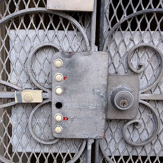 In contrast with many home-brew domestic doorbell fixes, this one is easily understood. The black void where there was once a button for apartment number four has been addressed, so to speak, with a newer-model plastic standalone item. The photo may not make this clear, but that isn’t duct tape around the newer button. It’s a metal sheath of the same material as the gate. Despite what the varied buttons suggest, someone is in fact concerned with design continuity at this multi-unit building. If the broken button wasn’t easily rewired, the question lingers as to whether up in apartment four this new button is mirrored by a new bell. Perhaps every time it rings, it echoes through the building as a reminder to neighbors of other petty differences.